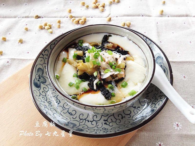 12:将煮好的卤汁,轻轻的浇在凝固的豆浆上,撒上榨菜碎块和香葱(或香菜)即可。