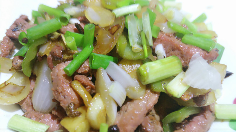 8:-放入滑散的牛肉段大火翻炒,出锅时加一点点醋