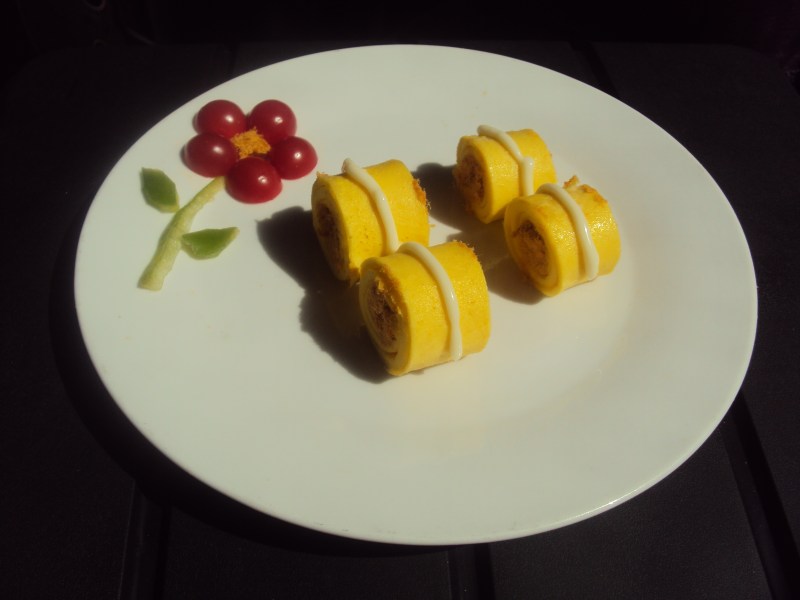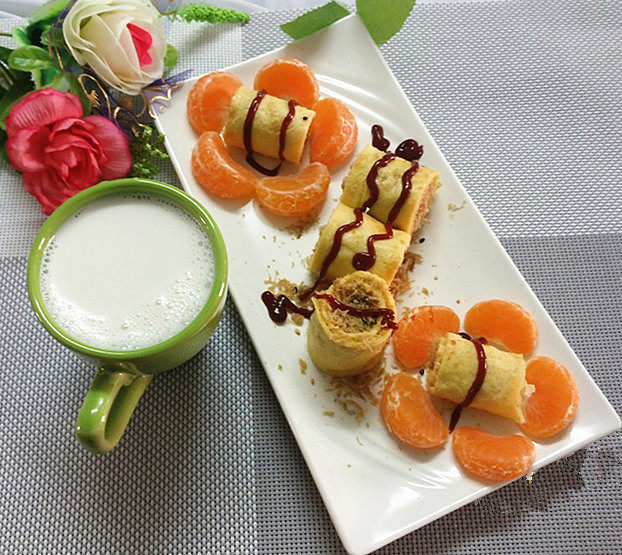 8:将蛋饼卷起,用丘比沙拉酱封口