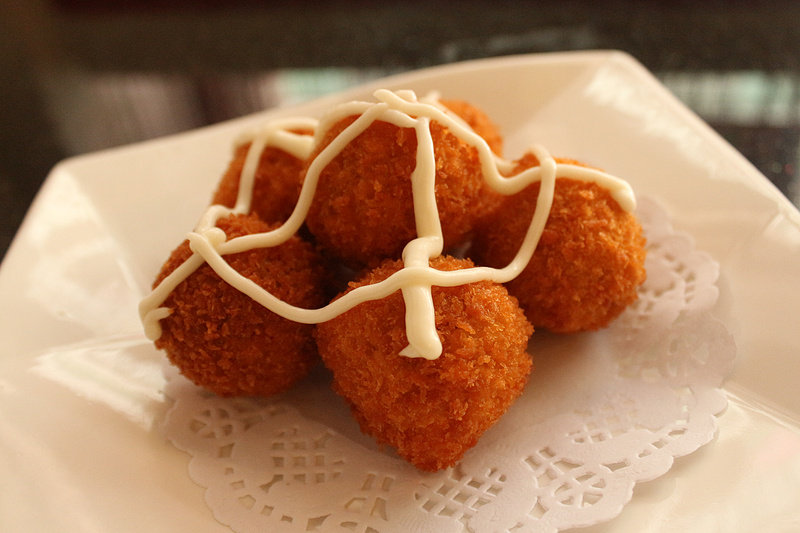 4:牛肉丸滚上蛋液然后裹上面包糠(初次操作可能会出现面包糠覆盖不全面的问题再重复一遍步奏4即可不会影响口感PS:初次发菜谱漏图了T.T)