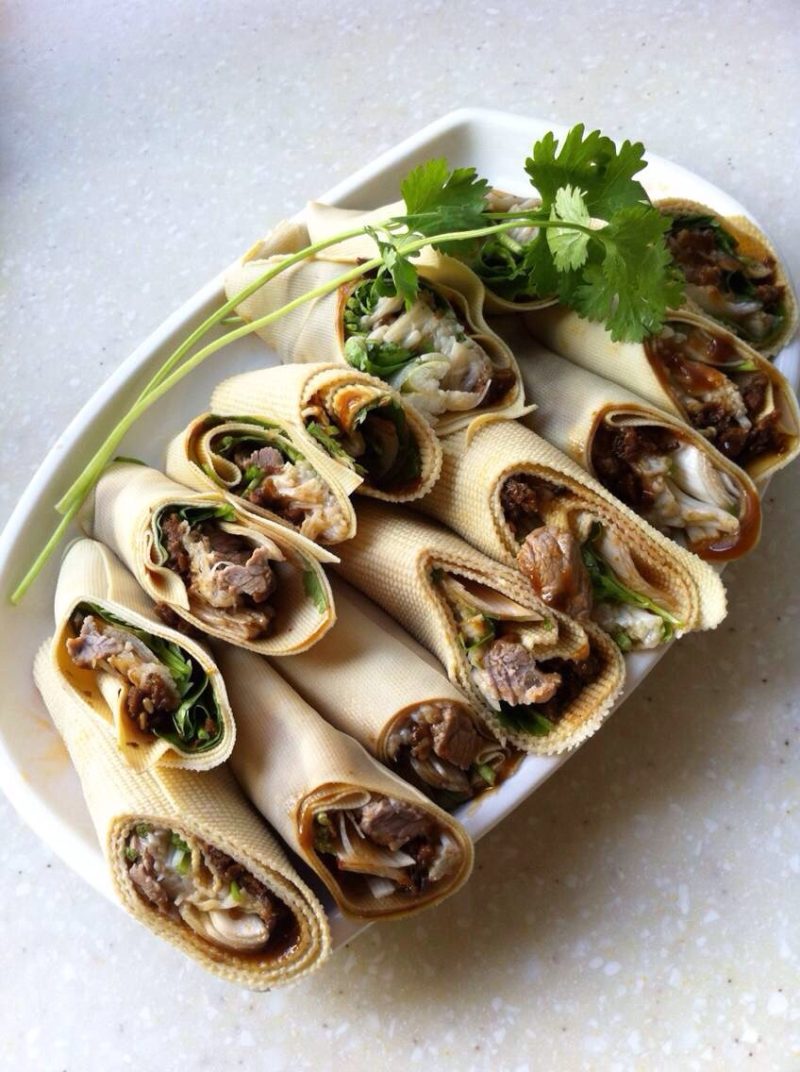 3:葱丝香菜洗净抹上老干妈酱,用豆皮卷起来