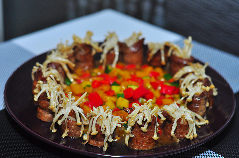 牛肉适量;金针菇适量;红甜椒适量;黄甜椒适量;黄瓜适量;