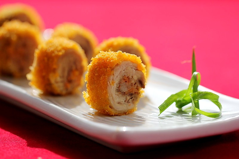 13:加热油,油六、七成热时放入鸡卷去炸;