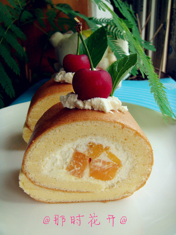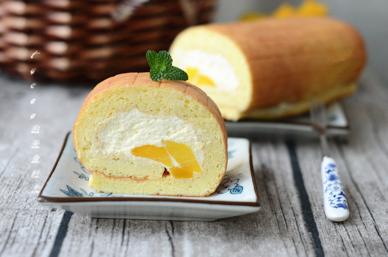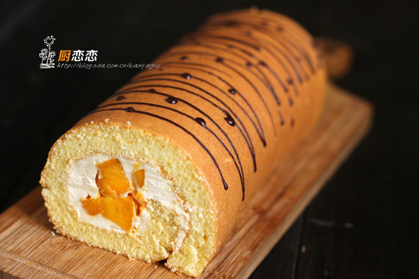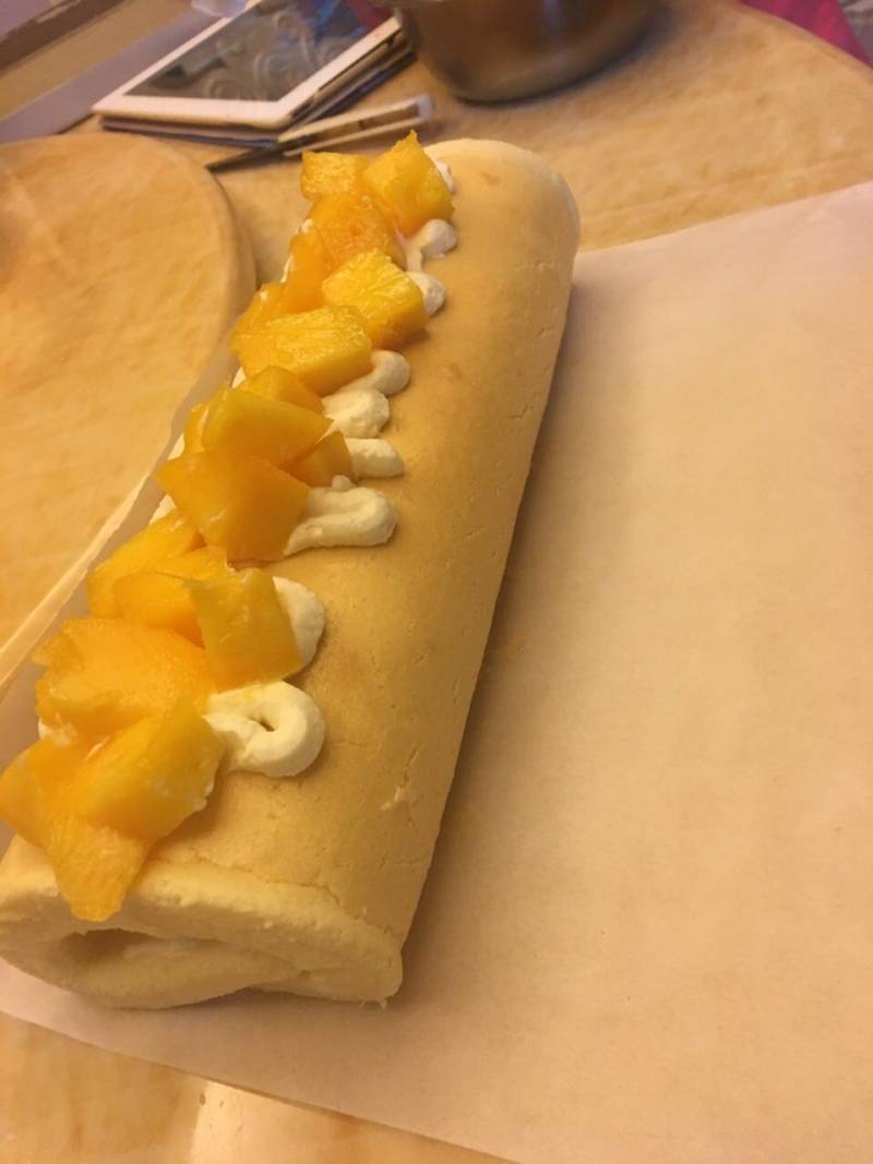 7:卷起近端多刷奶油,选端少点,卷好定型,铺上芒果就好了。朋友说上面卷外面,金黄好看,所以这次卷的外面是烤盘上面的,有点开裂,以前都是底部卷,不会开裂。个人喜欢底部在外面。