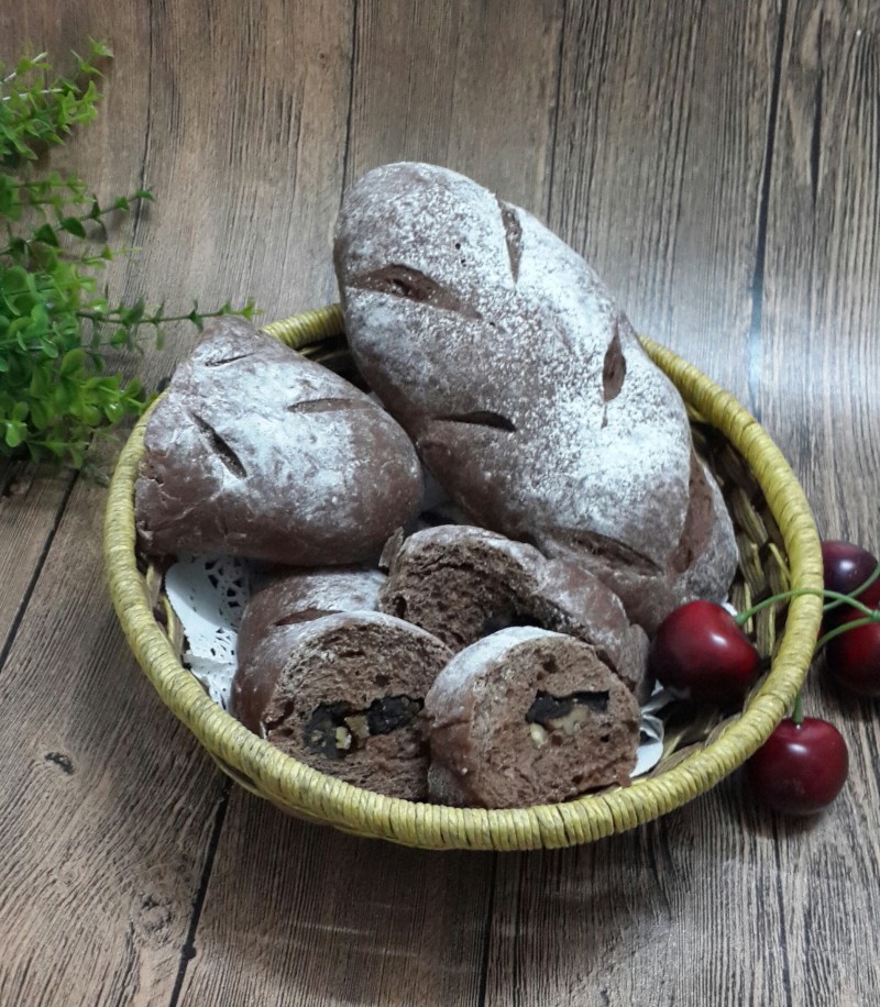 高粉250克;可可粉10克;橄榄油5克;糖30克;酵母3克;核桃仁25克;芝麻馅适量;