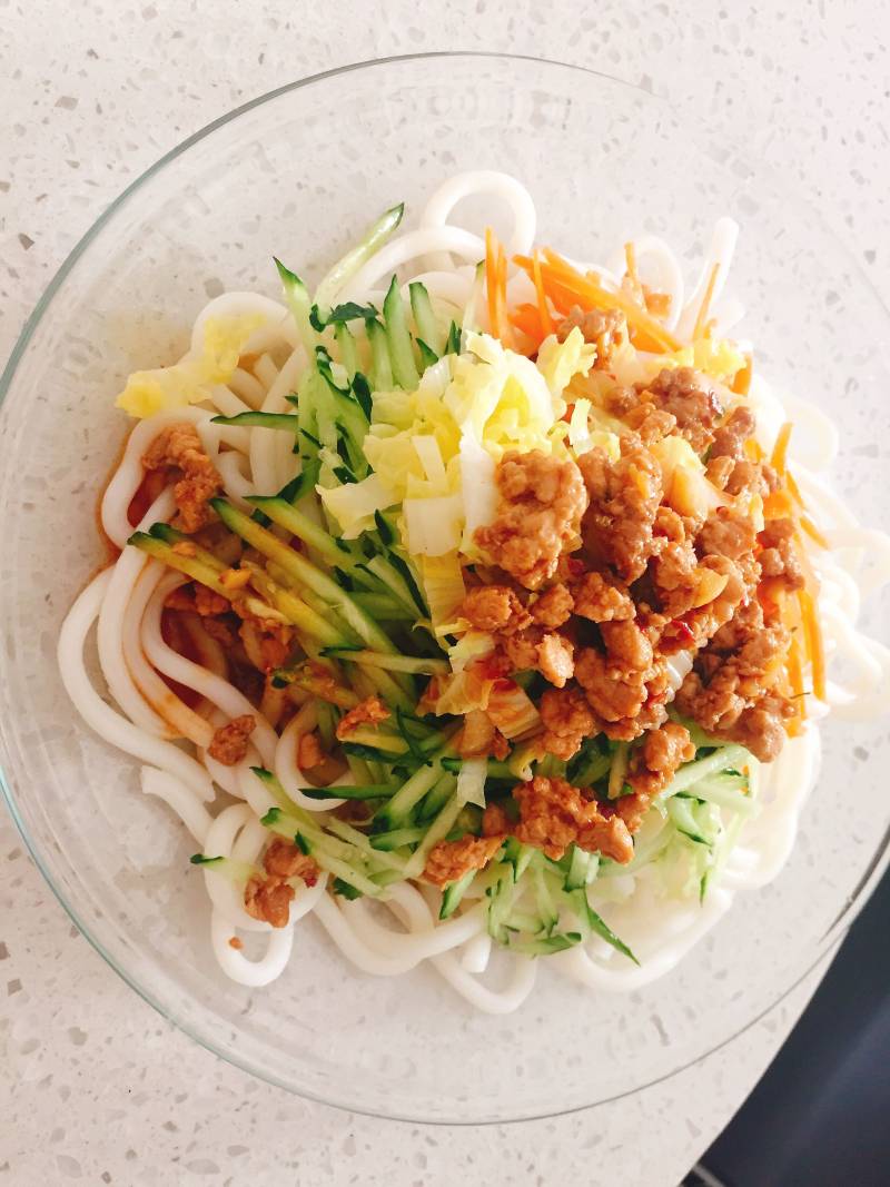 1:乌冬面两人份,肉馅,香辣酱,黄瓜,胡萝卜,娃娃菜,花生米