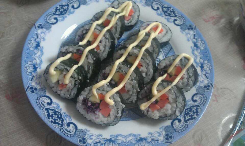 3:把寿司卷切段(刀呢沾点凉白开,更好切,米饭不会黏在刀背上,切出来的寿司段整齐好看)。最后配上自己喜欢的色拉酱,是不是又简单又好吃又有饱足感呢O(∩_∩)O可以当正餐,也可做下午茶,美美哒~