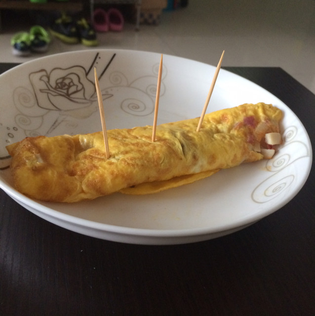7:成品出锅,还不错吧!可以抹一层番茄酱,卷上生菜、火腿肠吃,非常简单又美味。