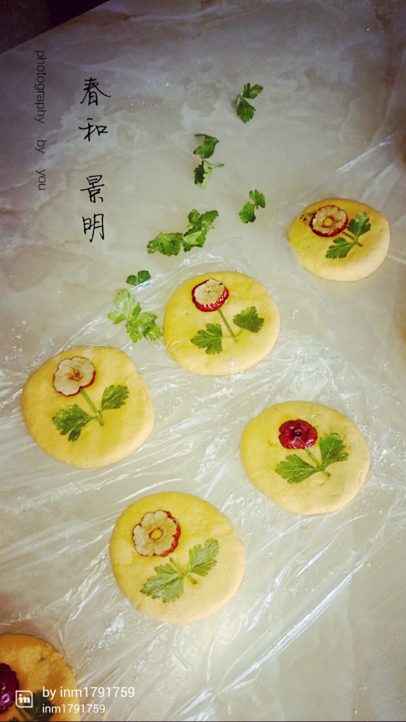 7:然后将红枣和芹菜叶装饰在南瓜饼上面,轻微压平,不漏馅就行,是不是看起来很壮观啊!