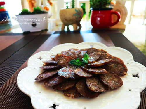 18:晾凉切片装盘,很多时候我是拿着一整根香肠再吃,省去切的步骤,好像更过瘾呢。