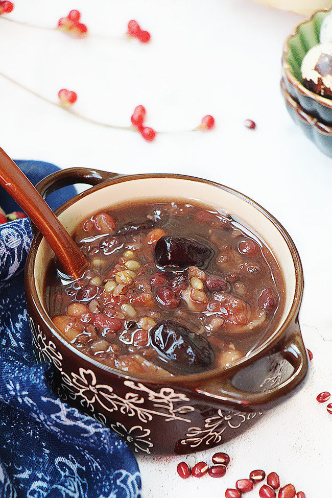 花生20克;糯米20克;大米30克;黑米20克;大麦仁20克;花豆20克;红小豆30克;红枣适量;干百合10克;