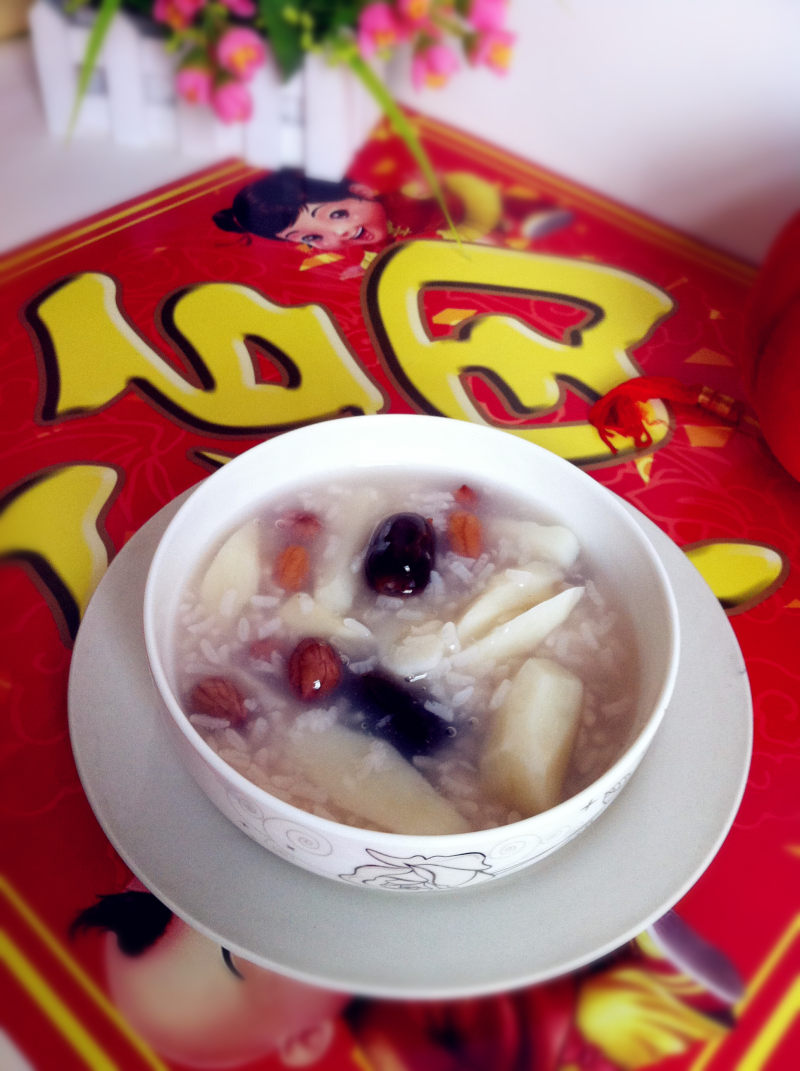 6:大约20分钟后,小米开始变的粘稠,放入红枣枸杞。