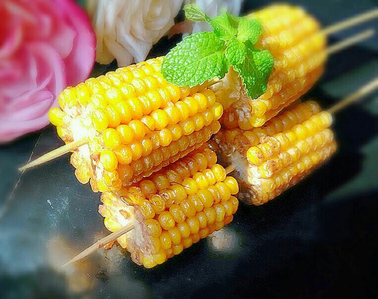 5:我这个烤了15分钟左右,因为玉米是熟的,烤多久无所谓的,自己掌握一下,插上筷子就可以开吃啦,也可以撒点孜然辣椒面,那样味道更好一下