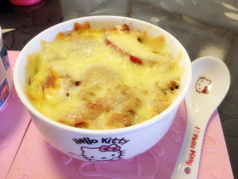 6:预热5分钟后,放进去烤了大概7分钟,芝士条熔了就ok。没有专用的碗,焗芝士饭专用的碗比较浅口会更佳。