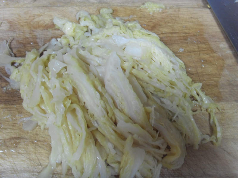 1:酸菜洗净,自家腌制的酸菜,无任何添加剂,吃得也放心。我掰下来大约5片,然后反复冲洗干净,切丝后再冲洗一遍攥掉水分。