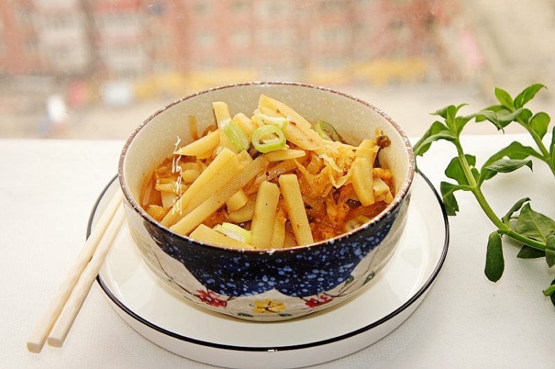 2:土豆1个,去皮洗净切条,不要切得太细,太细口感不好。土豆和酸菜一起炖,土豆的外皮不会很面,所以切条口感好,外脆里面,特好吃。