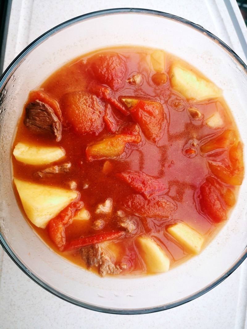 3:倒一大杯热水至锅中,放土豆块,番茄快,米酒,糖继续焖。