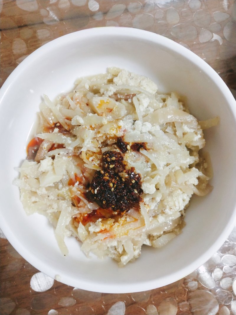 10:将土豆丝码在菜上,再将豆腐码在土豆丝上,加盐,加水,没过土豆丝。