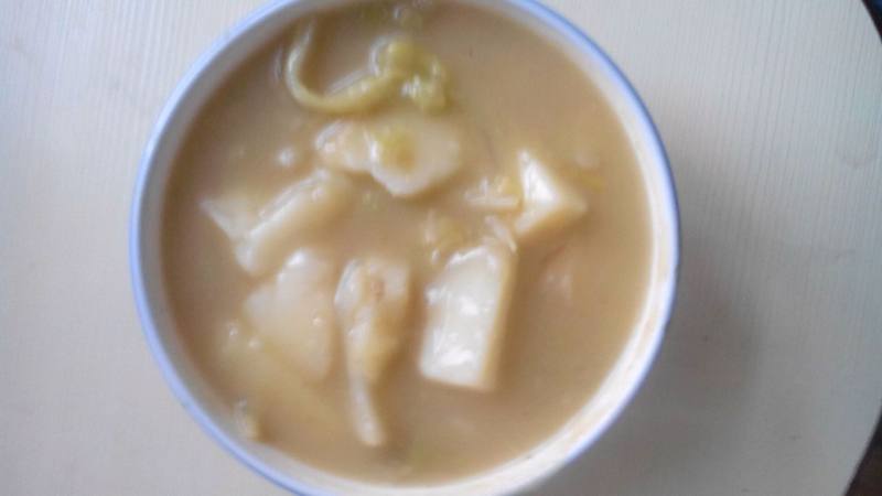 这道汤用五花肉煸炒的话会更好吃~~土豆的用量根据所需适量选取,我因为人比较多,所以用的土豆比较多大白菜我觉得手撕的切的好吃,嘻嘻面粉用凉水调和,面粉不易粘在一起最后,食材炖烂了才好吃呢~~