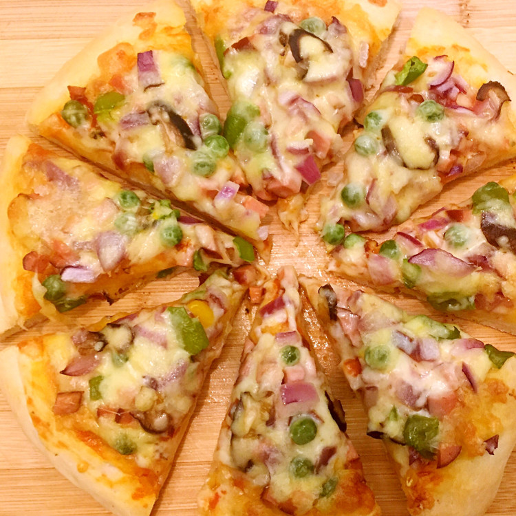1、面粉的材料大概是做一个10寸的披萨。8寸的披萨我的材料是高筋面粉70克,低筋面粉30克,奶粉5克,水65克,黄油8克,细砂糖5克,盐2克,干酵母2克。盐是必不可少的一个材料。2、黄油可以用植物油代替。3、我用的是不粘烤盘,所以底部不刷油。如果用披萨烤盘,需要在底部刷一层油或垫锡纸。4、因为没有备披萨酱,我是用番茄酱加牛至叶代替,味道也很不错。5、披萨上撒的材料可以根据自己喜欢的来准备。量的多少也是随意搭配。一般是先肉类后蔬菜,每一层都撒一些马苏里拉芝士。6、水分大的蔬菜一定要先焯一下水再撒上去,否则会让饼皮带水分而影响口感。7、喜欢脆一点的饼底可以先入烤箱烤5-10分钟。