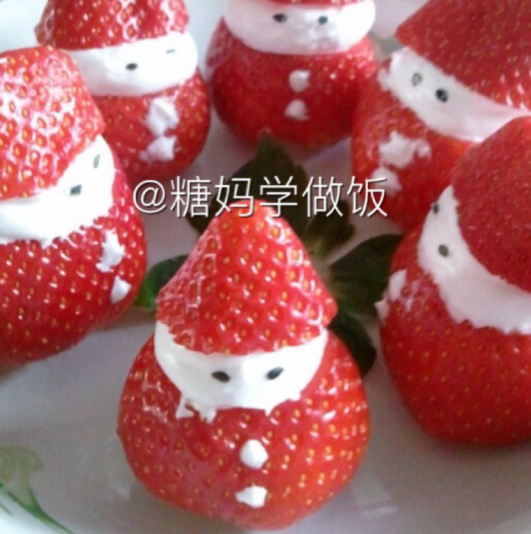 7:拿起草莓小雪人放入手中,取两粒黑芝麻当雪人的眼睛。