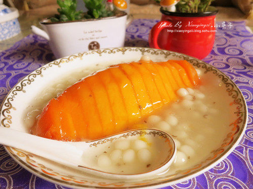 1:所有材料称量好,木瓜去皮刮瓤后顺切成1cm的片,木瓜入开水锅蒸10分钟后取出,将盘中的水倒掉不要