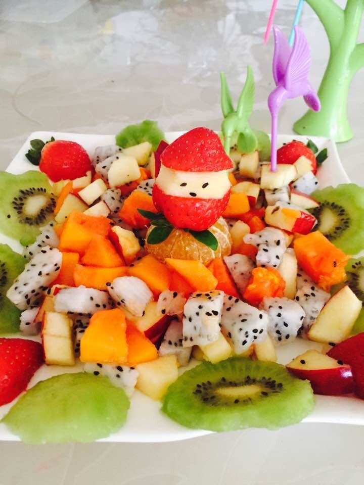 火龙果半个;猕猴桃一个;木瓜半个;苹果半个;小桔子一个;草莓三个;