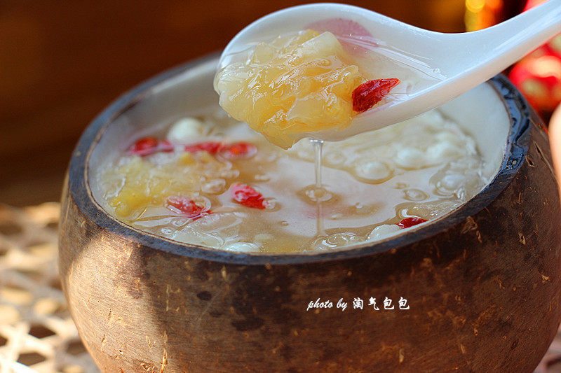 3:泡好的银耳和芡实一起倒入椰子里,在倒回椰汁