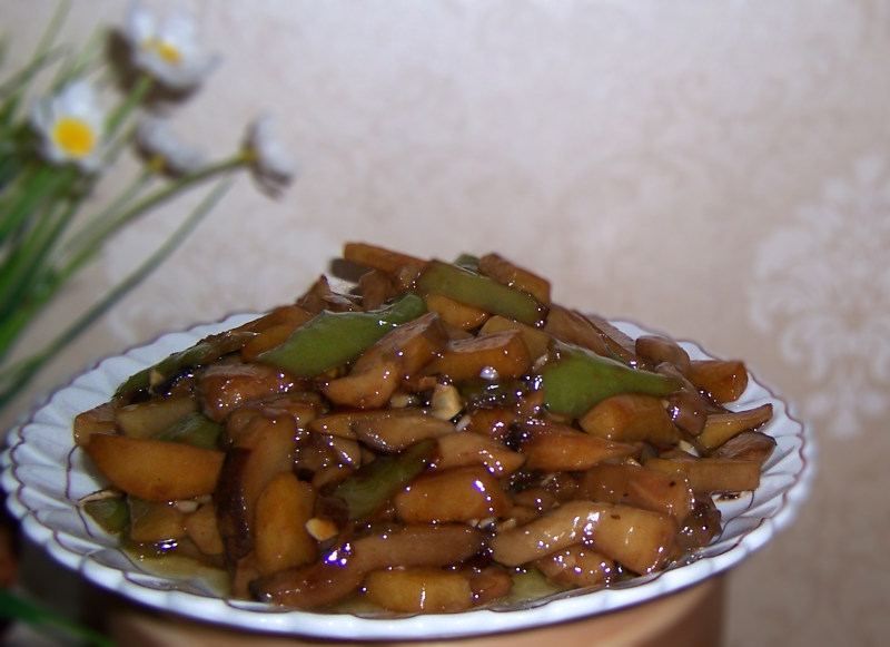 11:至土豆条和茄条熟倒入备好的加白糖的水淀粉,炒匀,撒蒜末儿