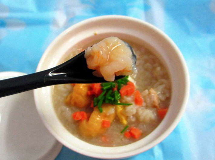 艇仔粥有些像改良版的海鲜粥,区别是配料丰富,种类繁多。没有一定确定的海鲜配料类别,家里平常有的都可以加进去,鲜虾,鱼肉,干贝,蟹棒等都OK。