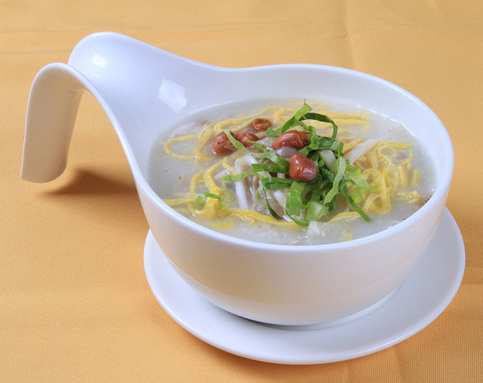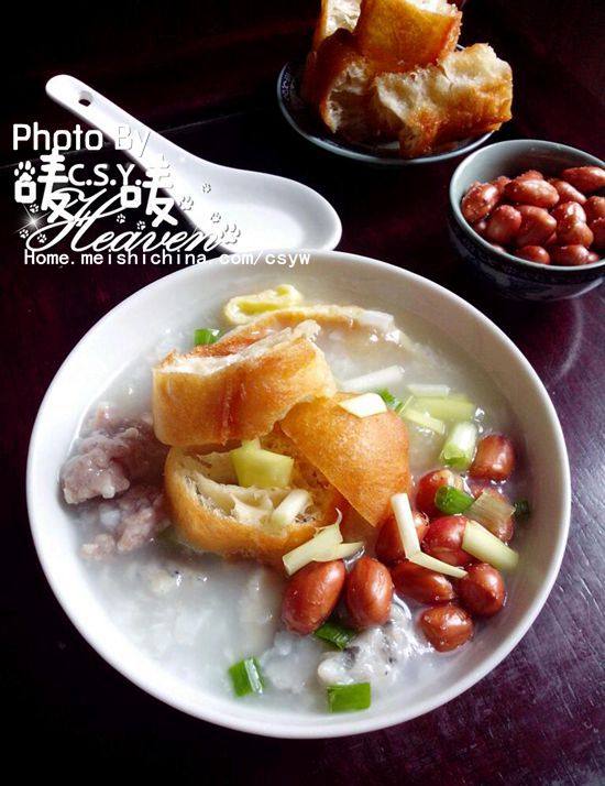 7:米粥熬至开花粘稠后,以此加入海鲜、炸猪皮,姜丝。加入盐,少量白胡椒调味。关火。加入鸡蛋皮丝、花生米、油条、炸粉丝。完毕,上菜!