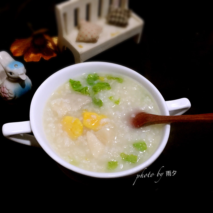 白粥适量;香菇适量;猪浮皮适量;鱼肉糜适量;猪肉糜适量;鸡蛋适量;