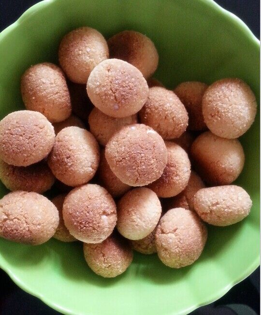 6:烤盘铺上油纸,搓成圆球,摆放在烤盘里(搓得有点不均匀,大小有点不一,请见谅),直到搓完,放入预热150度的烤箱,烤30分钟即可