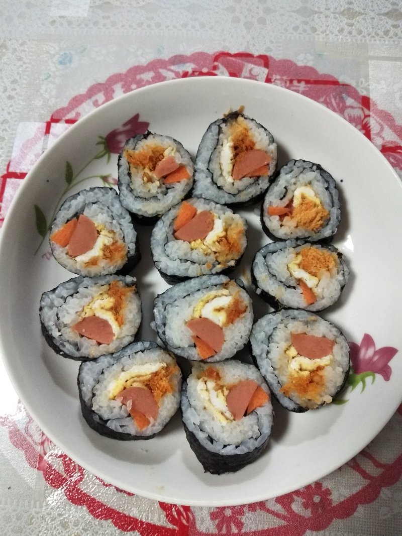 大米300克;萝卜条3条;小青瓜1要;脆皮肠2条;胡萝卜小半块;鸡蛋1只;紫菜4片;