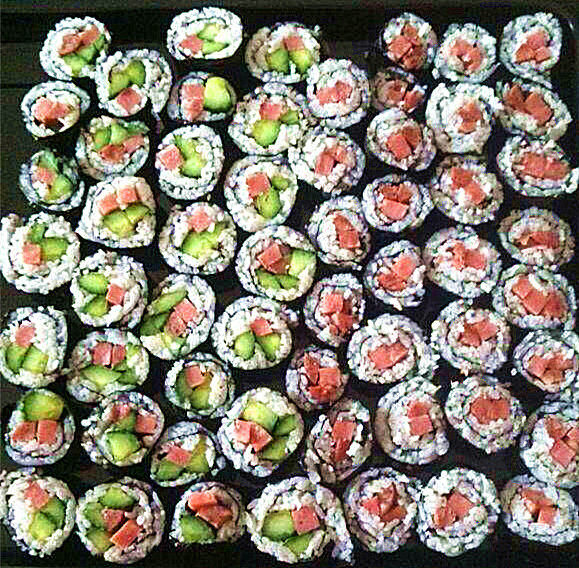 7:当当当当当,美味的寿司就可以享用了!大家在切寿司的时候一定要在刀上沾些水,切的时候切快点(因为米比较黏,这样比较好切一点)