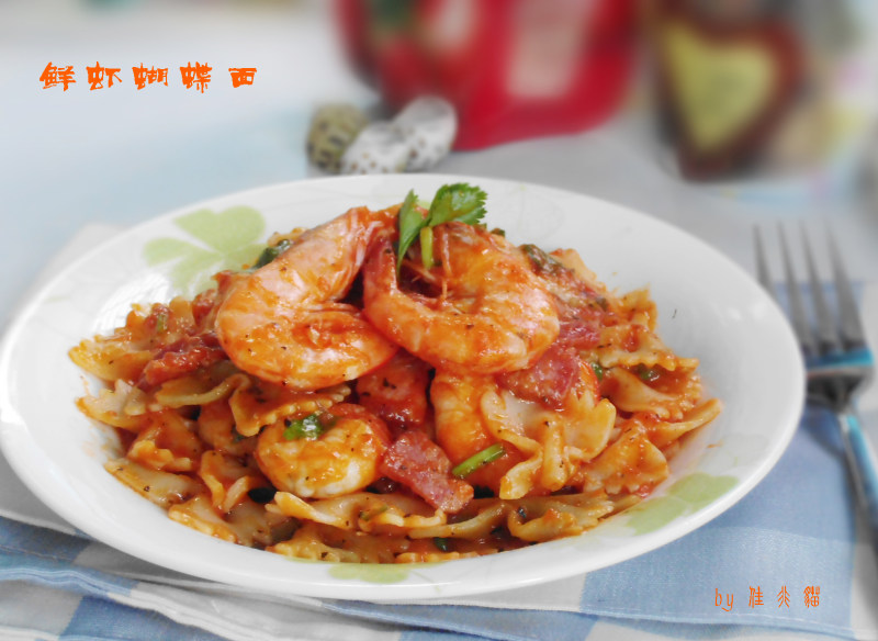 蝴蝶意面100克;鲜虾200克;番茄1个;培根2片;