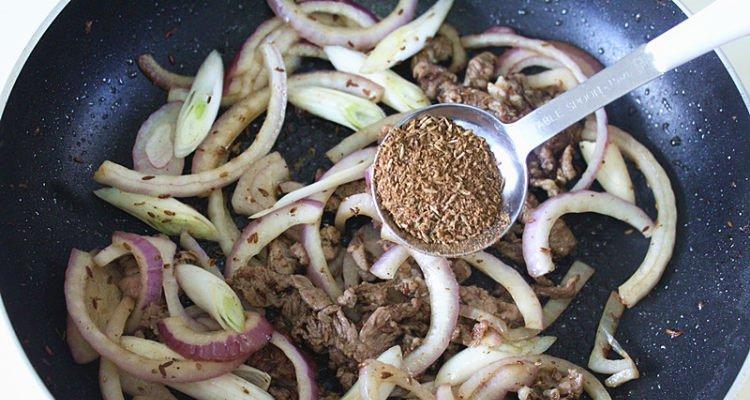 7.此时,加入适量的孜然粉,继续翻炒至肉片呈金黄色。