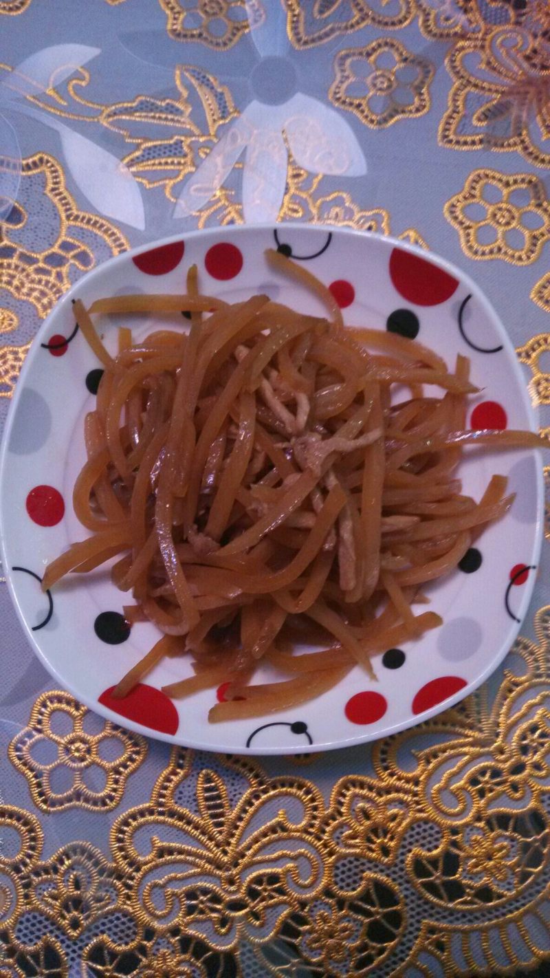 2:切丝,不用太细,以保持脆感,在温水中泡一会儿,去去多余的咸味儿。