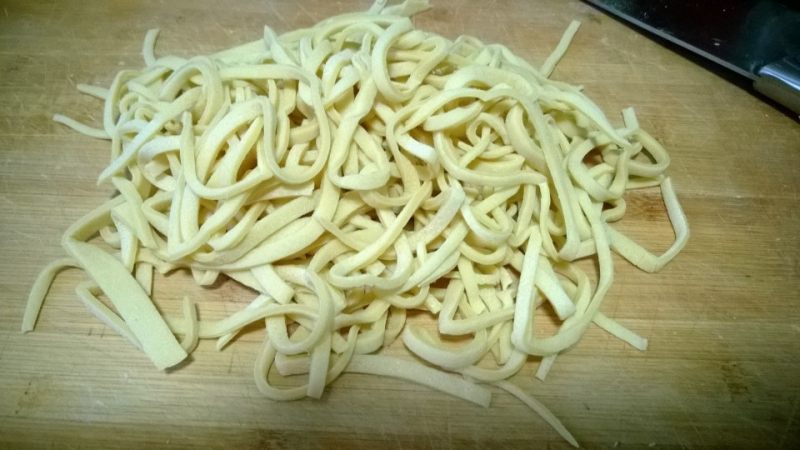 1:先把面皮铺平,然后用刀切成长条装,并用手揉搓把面皮拌开。