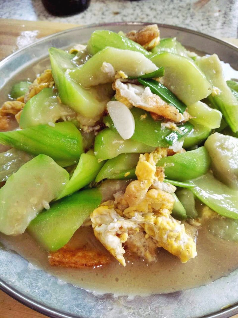 荷包蛋煎至两金黄焖出来的丝瓜会更香甜。