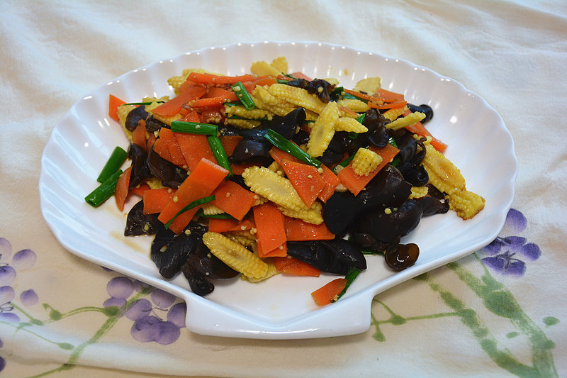 玉米笋适量;黑木耳适量;胡萝卜适量;葱适量;