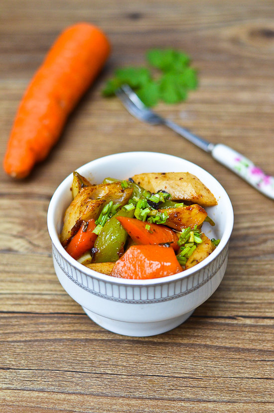 9:翻炒并加盖焖透,出锅前加上糖及生抽,按口味儿加盐,装盘后放上香菜香葱碎就好了。这里特别说明一下,锅具不同,有些锅具在焖的时候需要加水,根据自己的厨具调整。