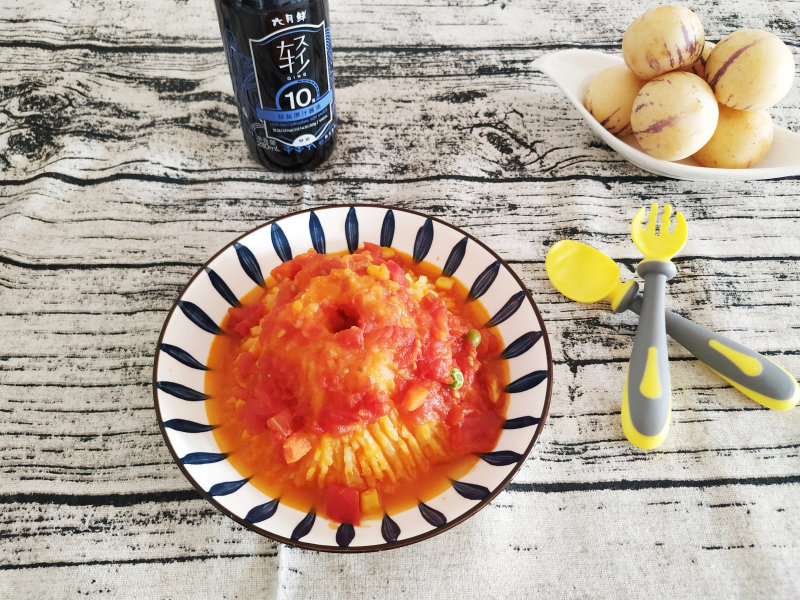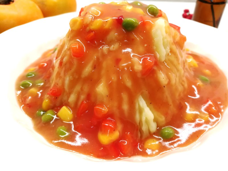 14:将炖煮好的茄汁淋在土豆泥上即可。