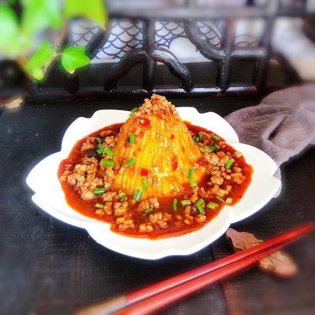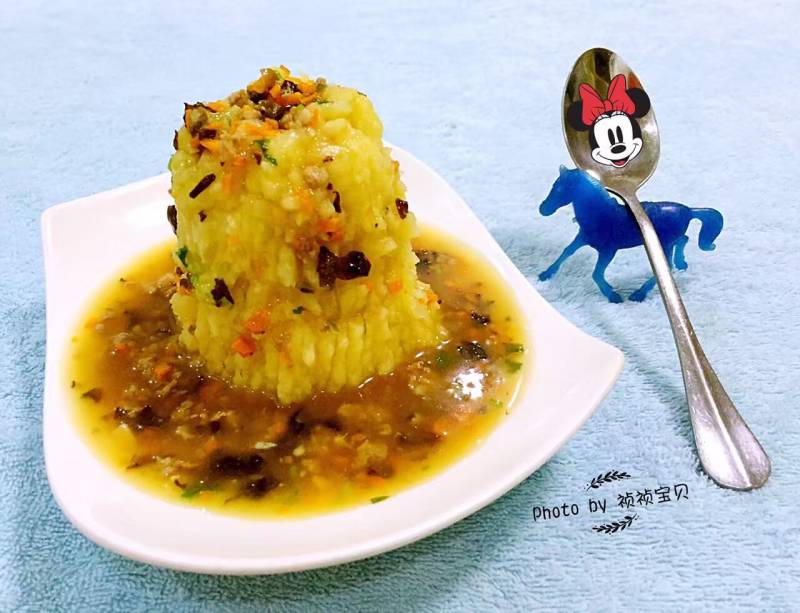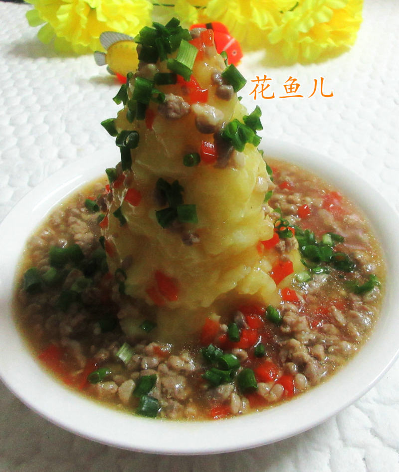 10:把肉末带汁水一起浇在准备好的土豆泥火山上,再撒上少许葱花即可。