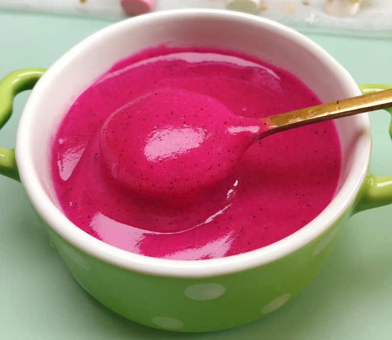 3:将火龙果肉放碗里压碎加入白糖和蜂蜜,起火用不粘锅,将火龙果放入不粘锅熬一下,不用太长时间,一分钟左右就好。将熬好的火龙果汁淋到火山状山药泥上,即可食用。