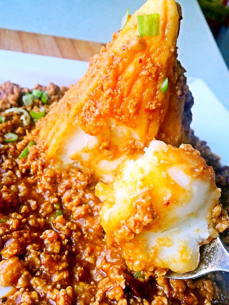 9:煮好的肉臊从上倒入土豆泥中即可。