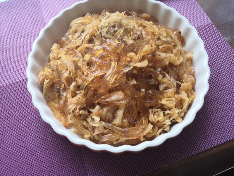 5:酸菜炒到水份都没了捞出水晶粉倒入酸菜中继续翻炒。
