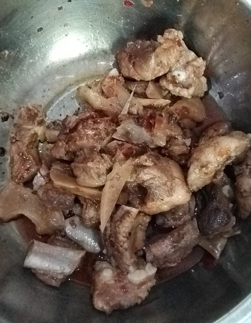 6:加入生抽、老抽翻炒均匀,至猪骨上色。