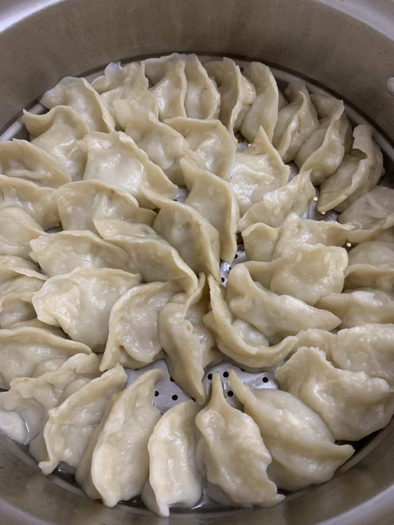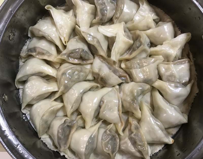 8:我是凉水把篦子摆进锅里,水开后大火蒸了8分,然后焖了有10分钟。(我这个蒸的是我们当地叫菜饺子,顾名思义就是菜比较多,肉少自然就不要蒸很久,肉多的话需要延长点蒸制时间)