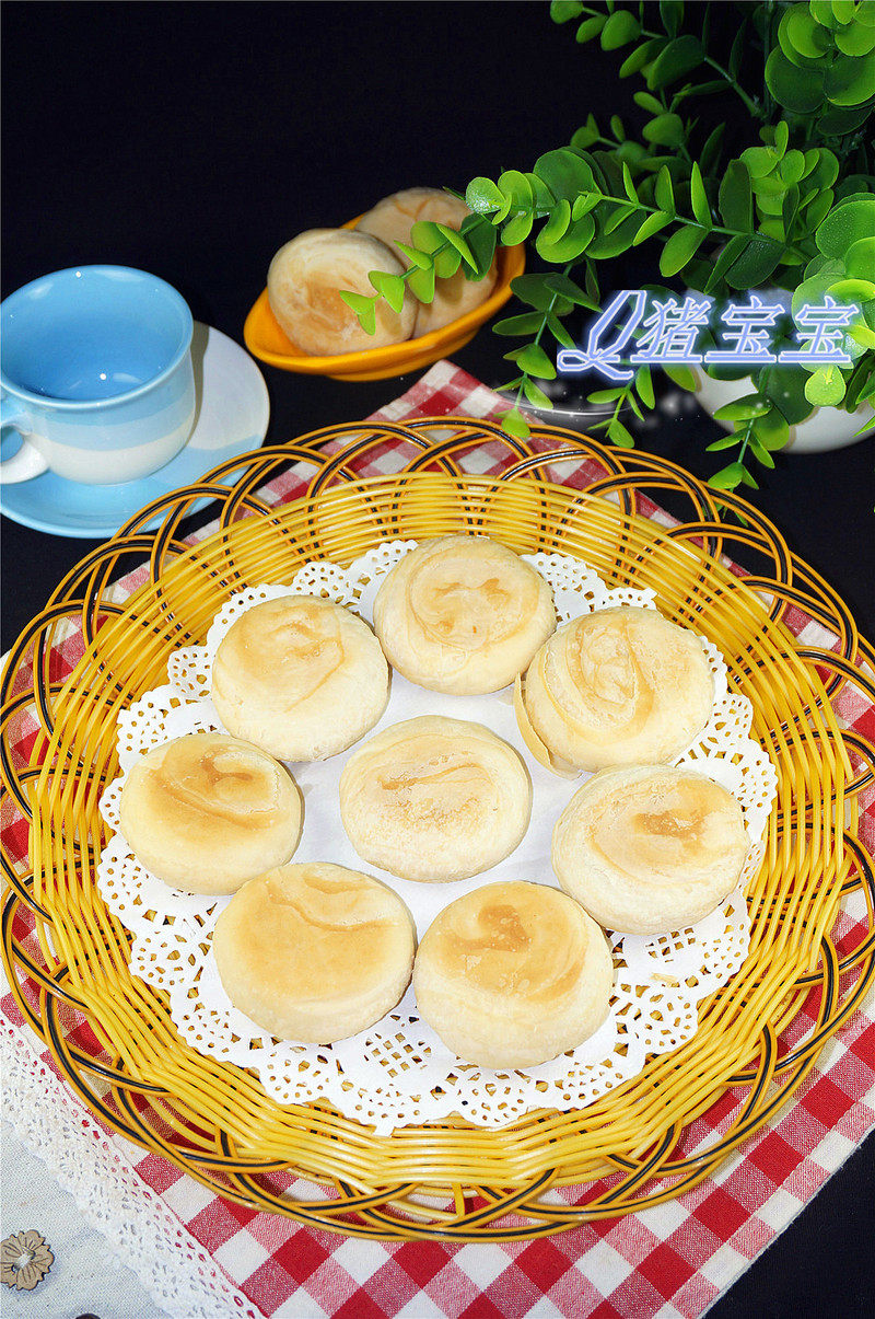 2:面皮:200g面粉、100g低粉、90g油、100g水、30g糖、3g、盐。酥皮:180g面粉、50g淀粉、90g油(均分成15个剂子)